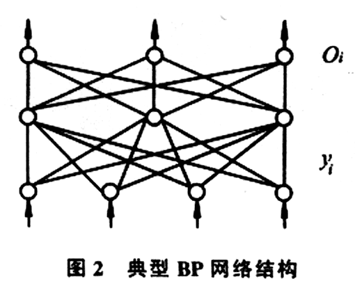 ???? (1)多層神經(jīng)網(wǎng)絡(luò)。多層神經(jīng)網(wǎng)絡(luò)不僅有輸入點Xj、輸出節(jié)點Oi,而且有1層或多層隱節(jié)點yi,典型BP神經(jīng)網(wǎng)絡(luò)模型見圖2。