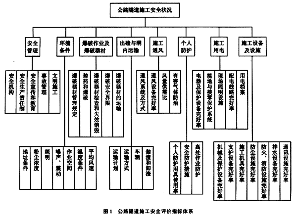 ???? 公路隧道施工安全評價體系是個自我完善的自成體系,有自成一體的安全評價通則和安全評價方法,但又不能脫離建設(shè)工程施工的大環(huán)境,應(yīng)和建設(shè)工程施工企業(yè)建立的有關(guān)體系相融合。公路隧道施工安全評價體系是對公路隧道施工中的安全管理、環(huán)境條件、爆破作業(yè)與爆破器材、出碴與洞內(nèi)運輸、施工通風、個人防護、施工用電和施工設(shè)備及設(shè)施的綜合評價,公路隧道施工安全評價指標體系如圖1。