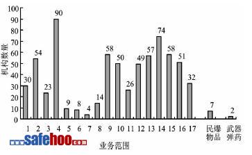 ??????? (1) 甲級資質(zhì)安全評價機構(gòu)業(yè)務(wù)范圍與評價機構(gòu)的數(shù)量對照如圖3 所示。