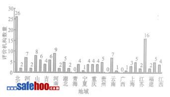 ??????? 湖北等地區(qū),分別為33 家、24 家、24 家、24 家和21家;安徽、青海、海南、新疆、江西、廣西、陜西、西藏、江蘇、甘肅等10 個地區(qū)的評價機構(gòu)均未超過3 家。