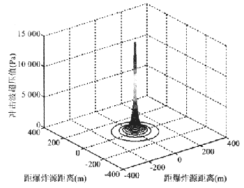 沖擊波波陣面上的超壓平面等高線如圖4所示,三維等高線和爆炸沖擊波立體曲面如圖5所示。