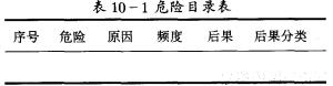 將辨識的危險、原因、后果列于危險目錄表(見表10-1),表中“頻度”和“后果分類”兩項的選擇見下款。