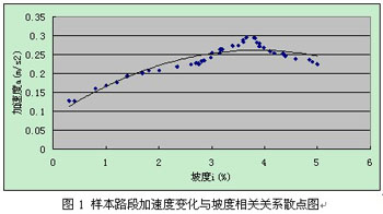 從圖中可以看出,加速度隨著坡度的增加而逐漸有所增加,回歸曲線的拐點(diǎn)位置大約在坡度為3.8%左右的位置上,此后,加速度開始有明顯的回落。