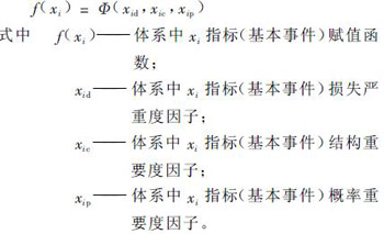 3)基本事件概率重要度原則,即具體煤礦“大系統(tǒng)”中各基本事件發(fā)生的概率的變化對頂上事件(即事故)發(fā)生概率的影響?;臼录怕手匾仍酱?,通過降低其概率,頂上事件(即事故)發(fā)生概率降低越大,事故越不易發(fā)生。同一基本事件可能在不同事故樹中出現(xiàn),其概率重要度可加權(quán)計算。該排序影響安全評價體系指標(biāo)中該基本事件或指標(biāo)的賦值,概率重要度越大,該基本事件賦值越高。綜上所述,具體煤礦安全評價體系的具體指標(biāo)權(quán)值的確定由下面函數(shù)確定: