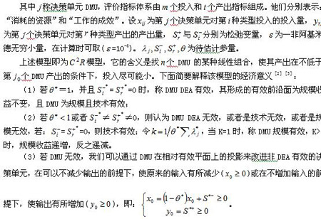 DEA方法為數(shù)據(jù)包絡(luò)分析(Data Envelopment Analysis的簡(jiǎn)稱),由Charnes等于1978年創(chuàng)建。它是以相對(duì)效率概念為基礎(chǔ)對(duì)同類多指標(biāo)投入、多指標(biāo)產(chǎn)出經(jīng)濟(jì)系統(tǒng)的相對(duì)有效性進(jìn)行評(píng)價(jià)的一種方法。