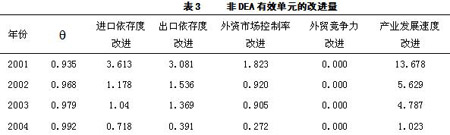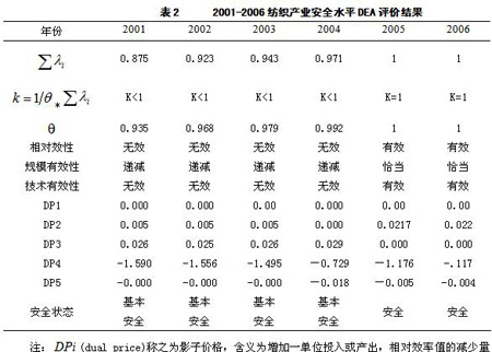 1.安全度分析。從表2的評(píng)價(jià)結(jié)果可以看出,2005和2006年評(píng)價(jià)結(jié)果為DEA有效,即產(chǎn)業(yè)安全狀態(tài)達(dá)到最優(yōu);其它年份的DEA值均小于1,為非DEA有效,即產(chǎn)業(yè)處于非安全狀態(tài)。總體來(lái)看,從2001-2006年這六年期間,我國(guó)紡織行業(yè)產(chǎn)業(yè)安全度水平呈不斷上升的趨勢(shì)。