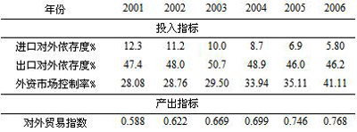 選擇投入產(chǎn)出指標(biāo)主要考慮以下方面:首先,所選擇的指標(biāo)能夠滿足評(píng)價(jià)的要求,客觀反映評(píng)價(jià)對(duì)象的安全度;其次,從技術(shù)上盡量避免投入產(chǎn)出內(nèi)部指標(biāo)間具有較強(qiáng)的線性關(guān)系;根據(jù)評(píng)價(jià)目的和選擇指標(biāo)的要求,設(shè)置輸入指標(biāo)為:外資市場(chǎng)控制率、進(jìn)口依存度、出口依存度;輸出指標(biāo)為:國(guó)際競(jìng)爭(zhēng)力指數(shù)、產(chǎn)業(yè)發(fā)展速度[4]。