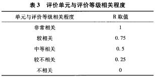 模糊關(guān)系矩陣的建立方法很多,本研究將采用多維量表法來確定模糊關(guān)系矩陣R0rii的取值如表3所示。