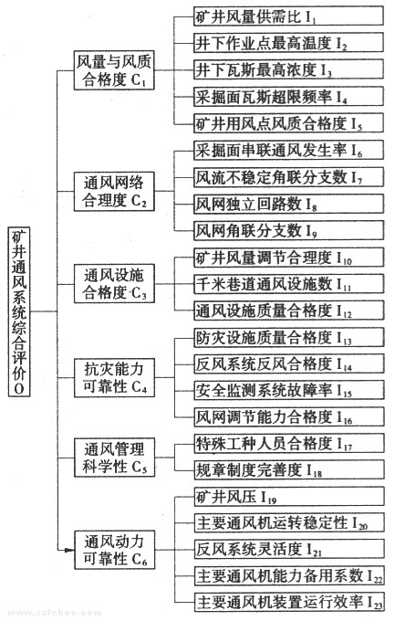 礦井通風(fēng)系統(tǒng)是利用通風(fēng)動(dòng)力向井下備用風(fēng)地點(diǎn)提供優(yōu)量足夠的新鮮空氣,稀釋并排出有毒有害氣體,營(yíng)造一個(gè)安全舒適的作業(yè)環(huán)境,其優(yōu)劣與否直接影響工人的身體健康和生命安全。由于影響通風(fēng)系統(tǒng)的因素很多,衡量礦井通風(fēng)系統(tǒng)優(yōu)劣的指標(biāo)也很多。因此,評(píng)價(jià)礦井通風(fēng)系統(tǒng)安全與否是個(gè)重要而復(fù)雜的問(wèn)題,做好這項(xiàng)工作,對(duì)提高礦井通風(fēng)系統(tǒng)管理具有重要意義。