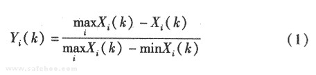 由于系統(tǒng)中各因素的物理意義不同,導(dǎo)致數(shù)據(jù)的量綱也不一定相同,這樣在比較數(shù)據(jù)時(shí)就難以得到正確的結(jié)果,為了便于分析,保證各因素具有等效性和同序性,因此需要對(duì)原始數(shù)據(jù)進(jìn)行處理,使之無(wú)量綱化和歸一化,即數(shù)據(jù)變換的問(wèn)題。常用的數(shù)據(jù)變換方法有:初值化處理、均值化處理、區(qū)間值化處理和歸一化處理。本文采用區(qū)間值變化法進(jìn)行數(shù)據(jù)處理,即