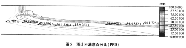 從圖5可以看出,PPD先逐漸變小,后又逐漸增大,筆者認(rèn)為,入口處的風(fēng)速較大,在離火源區(qū)較遠(yuǎn)處出現(xiàn)了人體感覺(jué)“偏冷”的現(xiàn)象,而隨著氣流不斷接近火源區(qū),吸收了火源區(qū)所擴(kuò)散出來(lái)的溫度,氣流得到了升溫,人體感覺(jué)逐漸地由冷至適中,所以在一定范圍內(nèi)PPD值得到了減小。