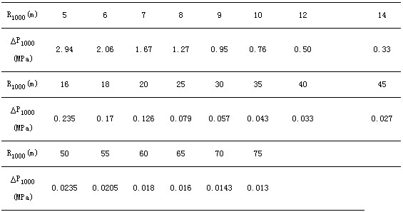 100kgTNT炸藥試驗,在空氣中爆炸時產(chǎn)生的沖擊波超壓見表1。以表1中R1000(m)為橫坐標(biāo)、ΔP0.5(MPa)為縱坐標(biāo),作圖,得出圖1。通過公式(3)計算TNT炸藥爆炸的模擬比,再根據(jù)公式(4)計算實際TNT當(dāng)量沖擊波超壓值。
