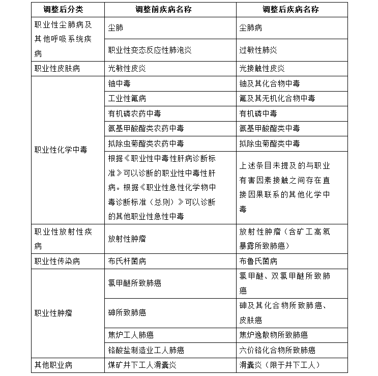 調(diào)整后仍然將職業(yè)病分為10類,其中3類的分類名稱做了調(diào)整。一是將原“塵肺”與“其他職業(yè)病”中的呼吸系統(tǒng)疾病合并為“職業(yè)性塵肺病及其他呼吸系統(tǒng)疾病”;二是將原“職業(yè)中毒”修改為“職業(yè)性化學(xué)中毒”;三是將“生物因素所致職業(yè)病”修改為“職業(yè)性傳染病”。