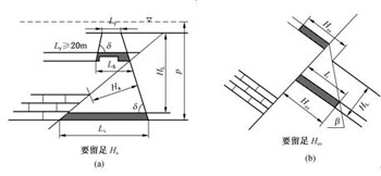 1)多煤層開采,當(dāng)上、下兩層煤的層間距小于下層煤開采后的導(dǎo)水裂縫帶高度時(shí),下層煤的邊界防隔水煤(巖)柱,應(yīng)當(dāng)根據(jù)最上一層煤的巖層移動(dòng)角和煤層間距向下推算(見圖3-7a)。