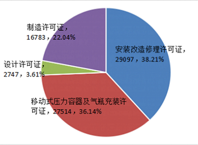 截至2021年年底,全國(guó)共有特種設(shè)備生產(chǎn)(含設(shè)計(jì)、制造、安裝、改造、修理)和充裝單位75134家,持有許可證76141張,其中:設(shè)計(jì)單位2742家,持有許可證2747張;制造單位16278家,持有許可證16783張;安裝改造修理單位29061家,持有許可證29097張;移動(dòng)式壓力容器及氣瓶充裝單位27053家,持有許可證27514張。(見圖2)