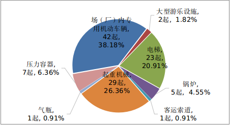 按設(shè)備類別劃分,鍋爐事故5起,死亡6人;壓力容器事故7起,死亡11人;氣瓶事故1起,死亡1人;場(chǎng)(廠)內(nèi)專用機(jī)動(dòng)車輛事故42起,死亡34人;起重機(jī)械事故29起,死亡30人;電梯事故23起,死亡17人;大型游樂設(shè)施事故2起;客運(yùn)索道事故1起。(見圖3、圖4)其中,場(chǎng)(廠)內(nèi)專用機(jī)動(dòng)車輛、起重機(jī)械和電梯事故占比較大,占事故總起數(shù)的85.5%、死亡總?cè)藬?shù)的81.8%。