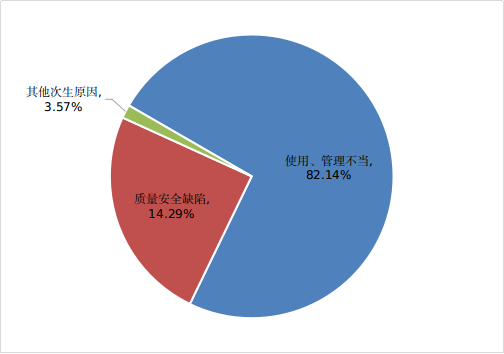 截至2021年年底,特種設(shè)備事故共結(jié)案56起,根據(jù)結(jié)案材料分析,事故原因主要分三類:一是因使用、管理不當(dāng)發(fā)生事故,約占82.14%。違章作業(yè)仍是造成事故的主要原因,具體表現(xiàn)為作業(yè)人員違章操作、操作不當(dāng)甚至無(wú)證作業(yè),維護(hù)缺失,管理不善等。二是因設(shè)備制造、維修檢修、安裝拆卸以及運(yùn)行過(guò)程中產(chǎn)生的質(zhì)量安全缺陷導(dǎo)致的事故約占14.29%。三是其他次生原因?qū)е碌氖鹿?,約占3.57%。(見圖8)
