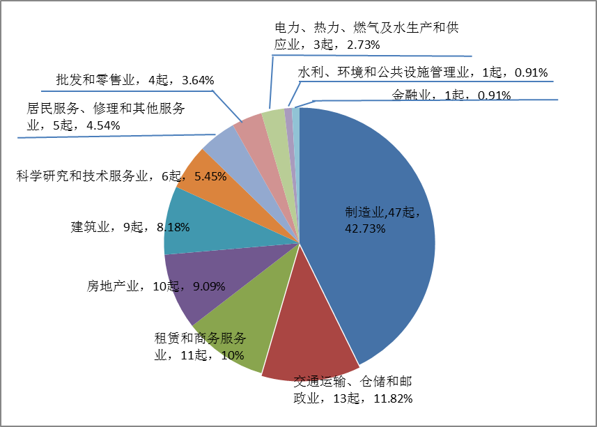 按涉事行業(yè)劃分,發(fā)生在制造業(yè)47起,占42.73%;發(fā)生在交通運(yùn)輸、倉(cāng)儲(chǔ)和郵政業(yè)13起,占11.82%;發(fā)生在租賃和商務(wù)服務(wù)業(yè)11起,占10%;發(fā)生在房地產(chǎn)業(yè)10起,占9.09%;發(fā)生在建筑業(yè)9起,占8.18%;發(fā)生在科學(xué)研究和技術(shù)服務(wù)業(yè)6起,占5.45%;發(fā)生在居民服務(wù)、修理和其他服務(wù)業(yè)5起,占4.54%;發(fā)生在批發(fā)和零售業(yè)4起,占3.64%;發(fā)生在電力、熱力、燃?xì)饧八a(chǎn)和供應(yīng)業(yè)3起,占2.73%;發(fā)生在水利、環(huán)境和公共設(shè)施管理業(yè)1起,占0.91%;發(fā)生在金融業(yè)1起,占0.91%。(見圖6)
