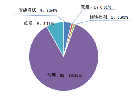 按發(fā)生環(huán)節(jié)劃分,發(fā)生在使用環(huán)節(jié)95起,占86.36%,維修環(huán)節(jié)9起,占8.18%,安裝調(diào)試環(huán)節(jié)4起,占3.64%,充裝環(huán)節(jié)1起,占0.91%。檢驗(yàn)檢測(cè)環(huán)節(jié)1起,占0.91%。(見圖5)