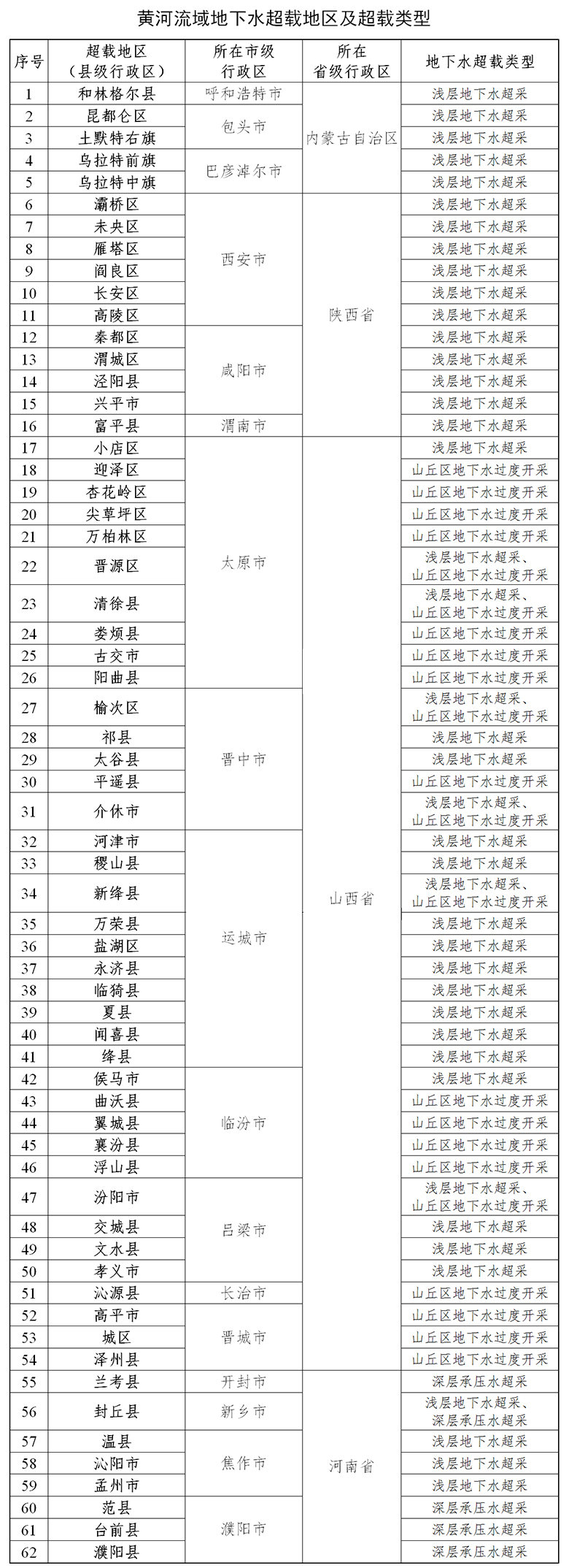 黃河流域共有62個(gè)縣級(jí)行政區(qū)地下水超載。按不同類型劃分,淺層地下水超采的有42個(gè)縣級(jí)行政區(qū),深層承壓水超采的有5個(gè)縣級(jí)行政區(qū),山丘區(qū)地下水過度開采的有22個(gè)縣級(jí)行政區(qū),同時(shí)存在2種類型的有7個(gè)縣級(jí)行政區(qū)。具體見下表。