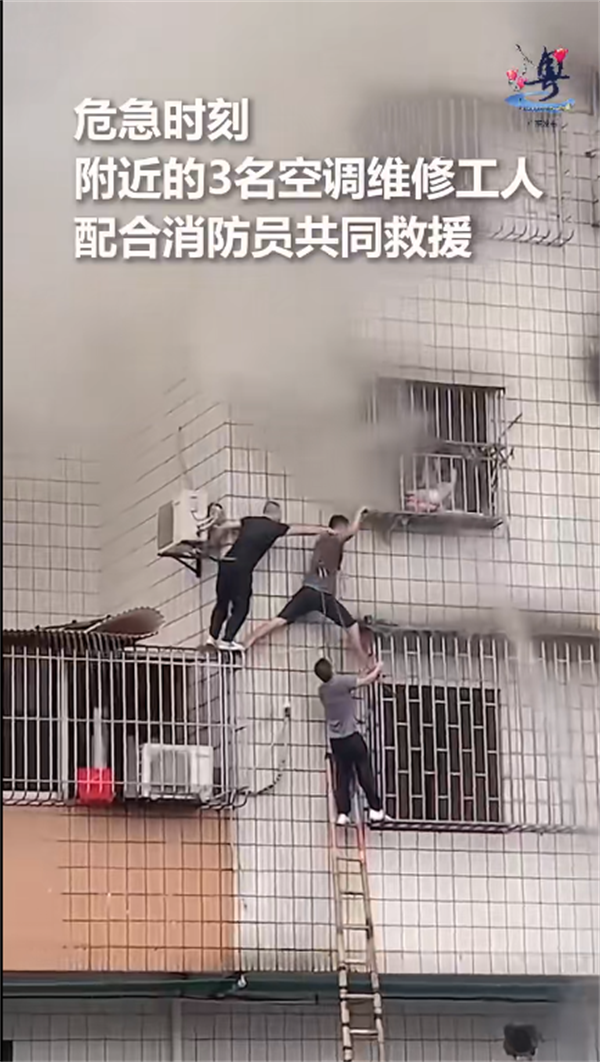 2023年11月10日中午,廣東佛山市禪城區(qū)一處民房3樓突然起火,事故現(xiàn)場火光沖天,一對母子被困在防盜網(wǎng)上,母親緊緊抱著孩子。危急時刻,附近一家空調(diào)店的老板和店員爬上梯子剪開防盜網(wǎng),協(xié)助消防員成功救出母子倆。