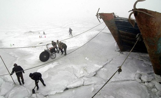 海冰災(zāi)害那段時間,在渤海沿岸可以看到,無數(shù)商船和漁船被冰封在海上,一片片如赤壁聯(lián)營,煞是壯觀。