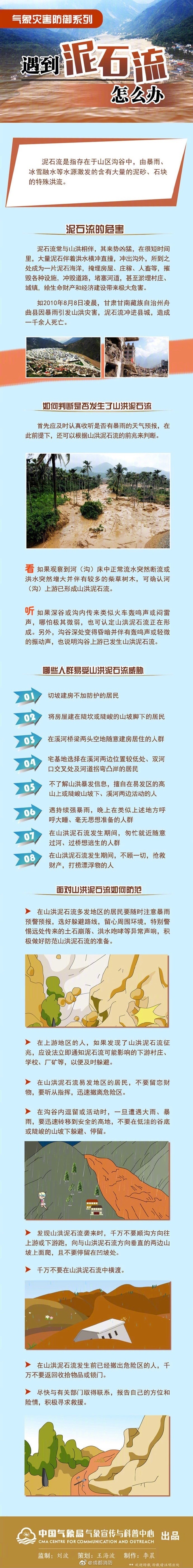 泥石流是指存在于山區(qū)溝谷中,由暴雨、冰雪融水等水源激發(fā)的含有大量的泥沙、石塊的特殊洪流。如何判斷是否發(fā)生了山洪泥石流?面對山洪泥石流如何防范?看圖了解一下。