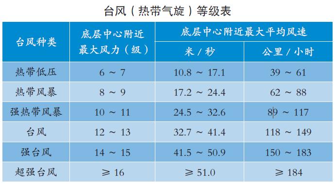 國家《熱帶氣旋等級》(GB/T 19201—2006)標(biāo)準(zhǔn)規(guī)定,熱帶氣旋按其底層中心附近最大平均風(fēng)速劃分為熱帶低壓、熱帶風(fēng)暴、強(qiáng)熱帶風(fēng)暴、臺風(fēng)、強(qiáng)臺風(fēng)、超強(qiáng)臺風(fēng)6個等級。