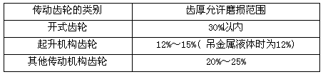 ?、輽z查齒輪的磨損情況(在節(jié)圓處量出),如達到下表所示數(shù)值,應更換。