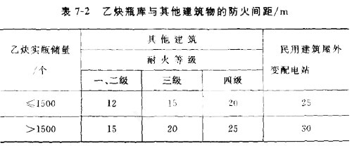 (1)乙炔瓶庫與建筑物和屋外變配電站的防火間距,不應(yīng)小于表7-2的規(guī)定。