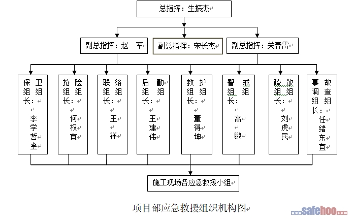 項(xiàng)目部組成以項(xiàng)目經(jīng)理生振杰為總指揮的應(yīng)急救援體系,成員由項(xiàng)目經(jīng)理部其他成員組成。應(yīng)急指揮中心設(shè)在項(xiàng)目部經(jīng)理辦公室。