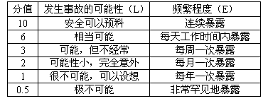 式中:D——風(fēng)險(xiǎn)值,L——發(fā)生事故的可能性大小,E——人員暴露于危險(xiǎn)環(huán)境的頻繁程度,C——發(fā)生事故產(chǎn)生的后果(見(jiàn)表1、表2)。