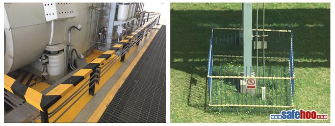 針對現(xiàn)場臨時電纜線布置,氧氣、乙炔瓶定置管理隨意性大,公司采取定點(diǎn)放置,設(shè)立標(biāo)志,即方便了員工的檢修工作,也解決了隨意擺放,亂拉亂接線的狀況,對以后的保持工作提供了可靠的保證。如圖1~6。針對容易在檢修過程中被踩踏和碰撞的重要管道如EH油管路,氫氣管道制作可靠的防護(hù),并設(shè)置標(biāo)志和警示,確保在運(yùn)行和檢修中防踩踏和碰撞,做到了本質(zhì)安全。如圖7~8。