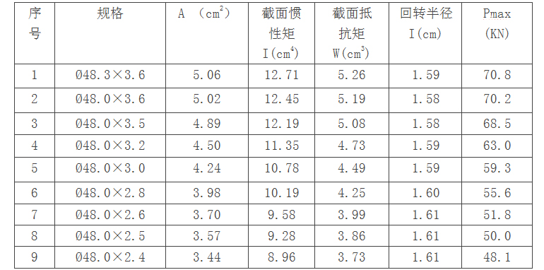 建筑工程操作架、安全防護(hù)架都以普通鋼管為主材。在現(xiàn)行《建筑施工扣件式鋼管腳手架安全技術(shù)規(guī)范》JGJ130中規(guī)定:腳手架鋼管宜用Ø48.3×3.6鋼管??墒菄鴥?nèi)大部分市場上沒有此型號鋼管,市場上有Ø48.0×2.6、Ø48.0×2.7、Ø48.0×2.8、Ø48.0×2.9、Ø48.0×3.0,壁厚超過3.0以上者市場流通領(lǐng)域無貨,廠家也不生產(chǎn),在模板架、外防護(hù)架體的設(shè)計計算時,鋼管壁厚最小可調(diào)整至3.0mm,其它壁厚品茗等安全計算軟件不支持,在編制模板架、防護(hù)架方案時工程技術(shù)按壁厚3.0mm進(jìn)行計算,要求材料采購人員采購或租賃3.0壁厚的鋼管,但市場上基本沒有,就用壁厚3.0以下的鋼管了,筆者認(rèn)為這樣不出安全事故是僥幸,出安全事故是必然。筆者對不同壁厚鋼管截面特征值及承載力統(tǒng)計如下表1。