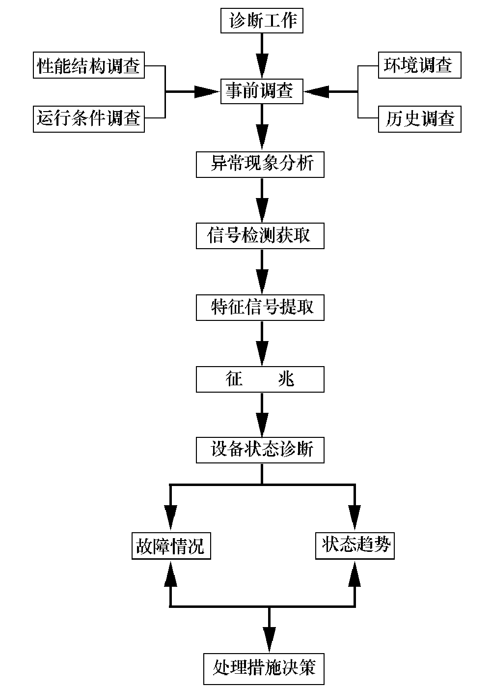設(shè)備故障診斷是人們借助一定的技術(shù)手段(檢測技術(shù)、分析理論方法、分析軟件等)對設(shè)備運行狀態(tài)及故障情況進行評判的過程。設(shè)備診斷過程可用程序框圖表示。