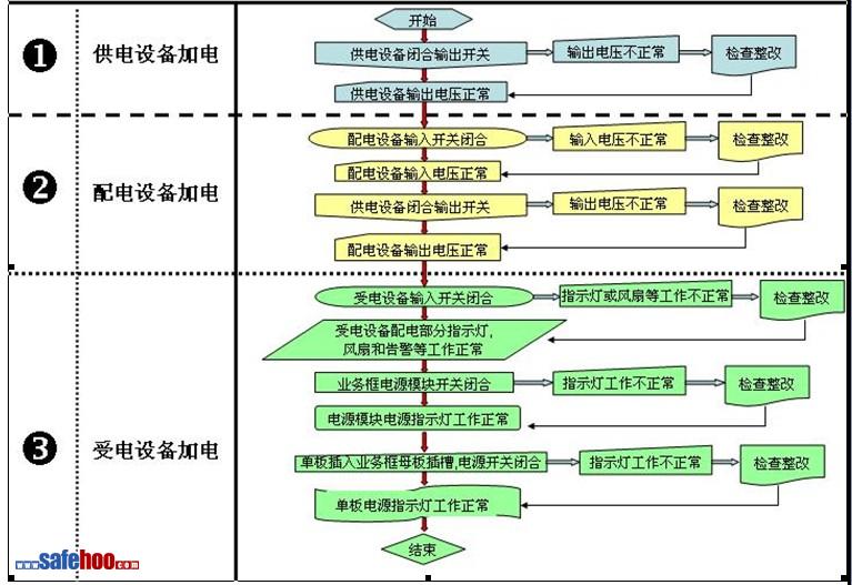 ??????????? 設(shè)備斷電應(yīng)取得業(yè)主同意,并在業(yè)主指派的監(jiān)督人指導(dǎo)下根據(jù)斷電的需求斷開對應(yīng)設(shè)備的開關(guān),業(yè)主側(cè)電源設(shè)備空開切斷應(yīng)由業(yè)主或業(yè)主指派人完成,設(shè)備斷電流程與加電流程相反: