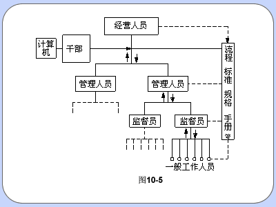 ?? 生產(chǎn)管理部門,如部、局、處、公司等屬于經(jīng)營者;廠、礦長受上級經(jīng)管者的領(lǐng)導(dǎo),履行管理職責(zé),又向下級(車間主任、工段長)監(jiān)督人員傳達(dá)指令,直至一般工作人員。這種上下流通的信息,有的是通過干部使用計(jì)算機(jī)對信息進(jìn)行整理,也有的是通過規(guī)程、標(biāo)準(zhǔn)等二次信息對各級人員傳達(dá)指示信息的。
