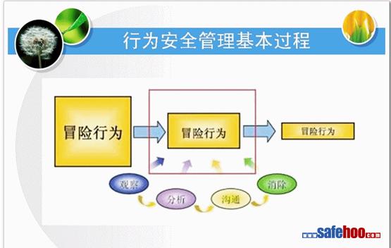 行為安全管理的核心是針對(duì)不安全行為進(jìn)行現(xiàn)場(chǎng)觀察、分析與溝通,以干擾或介入的方式,促使員工認(rèn)識(shí)不安全行為的危害,阻止并消除不安全的行為。上圖可示意這一過(guò)程: