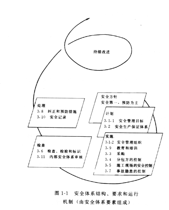 從圖1-1中可以看出,該標(biāo)準(zhǔn)規(guī)定的體系要素是建立在一個(gè)由“計(jì)劃、實(shí)施、檢查、處理”諸環(huán)節(jié)構(gòu)成的PDCA動態(tài)循環(huán)過程的基礎(chǔ)上。上述環(huán)節(jié),連同對體系運(yùn)行起主導(dǎo)作用的安全管理目標(biāo),是安全生產(chǎn)保證體系運(yùn)行體制和機(jī)制的基本模式,而每一環(huán)節(jié)又涉及若干要素。