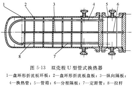 U型管式換熱器如圖5-13所示,U型管式換熱器僅有一塊管板。它是將管子彎成U型,管子兩端固定在同一塊管板上。由于殼體和管子分開,管束可以自由伸縮,不會因管壁、殼壁之間的溫度差而產(chǎn)生熱應力,熱補償性能好。管程為雙管程,流程較長,流速較高,傳熱性能好,承壓能力強。因U型管式換熱器僅有一塊管板,且無浮頭,所以結構簡單,造價比其他換熱器便宜,管束可以從殼體內(nèi)抽出,管外便于清洗,但管內(nèi)清洗困難,所以管內(nèi)的流體必須是清潔及不易結垢的物料。