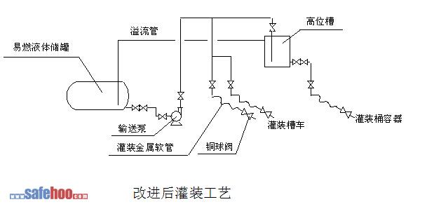 為杜絕此類事故的再次發(fā)生,公司組成了專門的技改小組,對(duì)成品裝卸設(shè)施進(jìn)行改造。同類廠家在灌裝桶裝液體時(shí)采取的辦法通常是:灌裝槽車時(shí)用大流量泵,而灌裝桶裝液體時(shí)則改為小流量低揚(yáng)程的泵,目的就是降低流速。技改小組根據(jù)公司自身特點(diǎn),采取了用高位槽自流灌裝的措施。改進(jìn)前后灌裝流程如下: