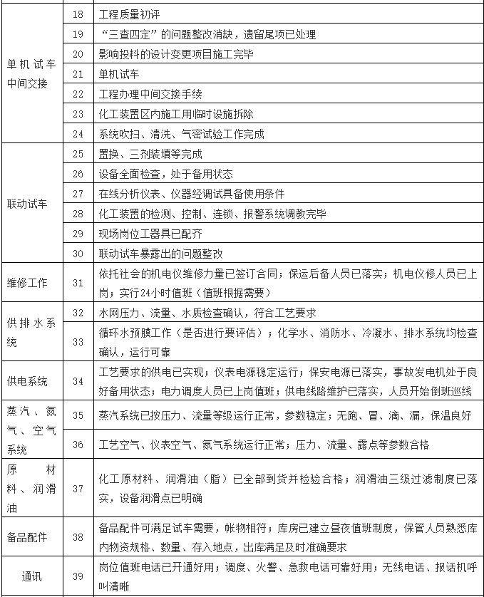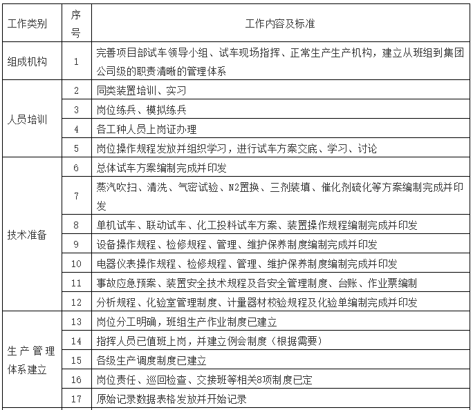 組織落實(shí)、明確責(zé)任;試車方案完備;安全措施及事故預(yù)案完備并經(jīng)業(yè)主方確認(rèn);