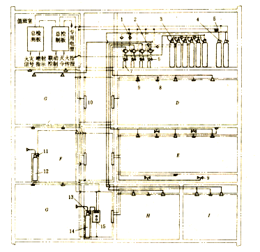 1—止回閥;2—選擇閥;3—氣動容器閥;4—電磁容器閥;5—壓力信號器;6—起動電磁閥;7—起動用CO<sub>2</sup>鋼瓶;8—火災探測器;9—噴嘴;10—分區(qū)檢控板;11—電磁容器閥(或電爆閥);12—無管系統(tǒng)滅火裝置Ⅰ(置于被保護區(qū)內(nèi));13—電磁容器閥(或電爆閥);14—無管系滅火裝置Ⅱ(置于被保護區(qū)外);15—分區(qū)檢控板