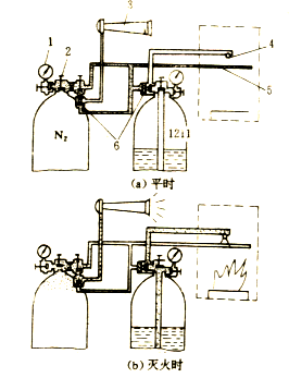 由于1211、1301滅火劑的沸點很低(分別為0℃和-20℃),因此鹵代烷固定式滅火裝置也可直接借火源起動,不用電氣控制。如圖1所示的裝置,由一個氮氣瓶和一個或多個1211瓶組成。氮氣瓶內(nèi)充有1.5MPa壓力的氮氣,1211瓶內(nèi)除裝有滅火劑外,還充有5.0MPa壓力的氮氣。平時探測管內(nèi)的氮氣使1211瓶上的活塞閥關(guān)閉,氮氣瓶上氣喇叭的活塞也關(guān)閉。發(fā)生火災時,探測管道首先被燒破,管內(nèi)氮氣泄出,壓力突然下降,兩個活塞閥都自動開放,1211瓶內(nèi)滅劑由管道經(jīng)噴嘴噴放滅火,氣喇叭同時鳴出報警。