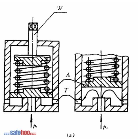 a為活塞式安全閥,閥芯是一平板。氣源壓力作用在活塞A上,當(dāng)壓力超過由彈簧力確定的安全值時(shí),活塞A被頂開,一部分壓縮空氣即從閥口排入大氣;當(dāng)氣源壓力低于安全值時(shí),彈簧驅(qū)動(dòng)活塞下移,關(guān)閉閥口。