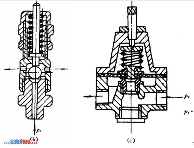 圖b和c分別為球閥式和膜片式安全閥,工作原理與活塞式完全相同。這三種安全閥都是彈簧提供控制力,調(diào)節(jié)彈簧預(yù)緊力,即可改變安全值大小,故稱之為直動(dòng)式安全閥。