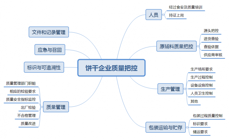 餅干生產(chǎn)企業(yè)應(yīng)設(shè)立質(zhì)量管理部門,職責(zé)包括但不限于: