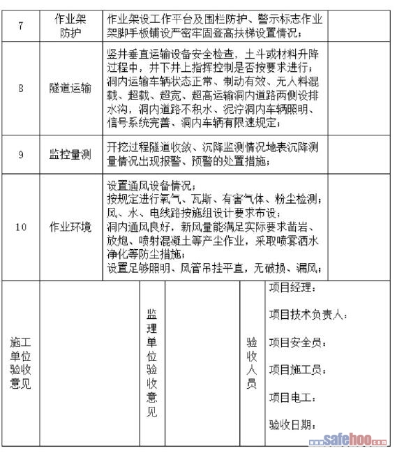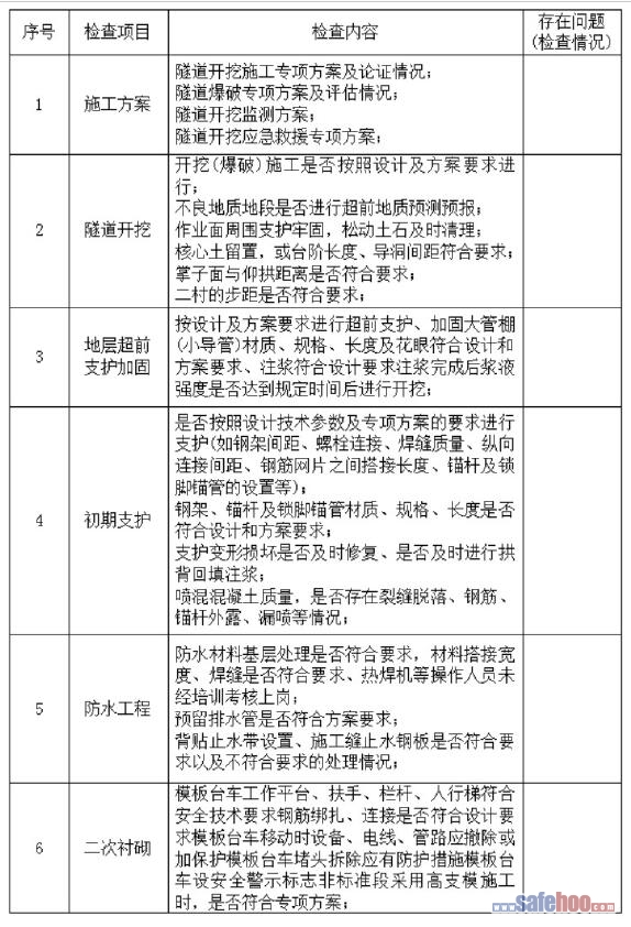 礦山法施工隧道現(xiàn)場(chǎng)安全檢查表