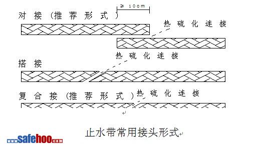 4、根據(jù)止水帶材質(zhì)和止水部位可采用不同的接頭方法,橡膠止水帶其接頭形式應(yīng)采用搭接或復(fù)合接,止水帶的搭接寬度不小于10cm。