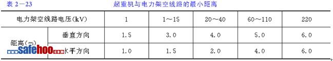 (3) 現(xiàn)場(chǎng)及其附近有電力架空線路時(shí)應(yīng)設(shè)專(zhuān)人監(jiān)護(hù),確認(rèn)機(jī)械與電力架空線路的最小距離必須符合表2-23的要求。